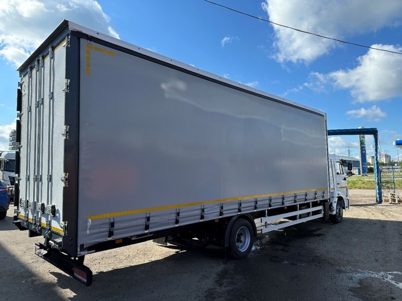 Установлена шторно-бортовая конструкция кузова со сдвижной крышей и раздвижными боковинами, что обеспечивает быструю и удобную погрузку или разгрузку с любой из трех сторон — сверху, сбоку или сзади, значительно ускоряя логистические операции.