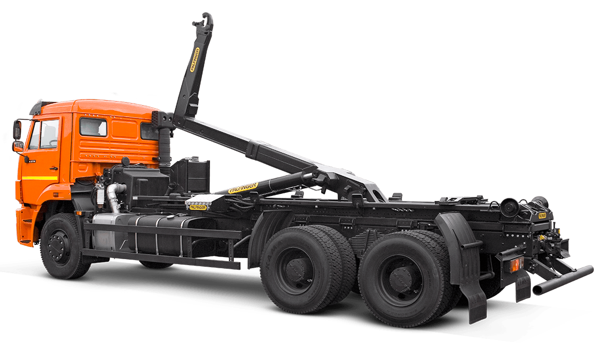 В продаже новый Крюковой погрузчик (мультилифт) KAMAZ-659613 на насси KAMAZ-6520 6х4, надежное навесное оборудование PALFINGER грузоподъемностью 17,8 тонн.