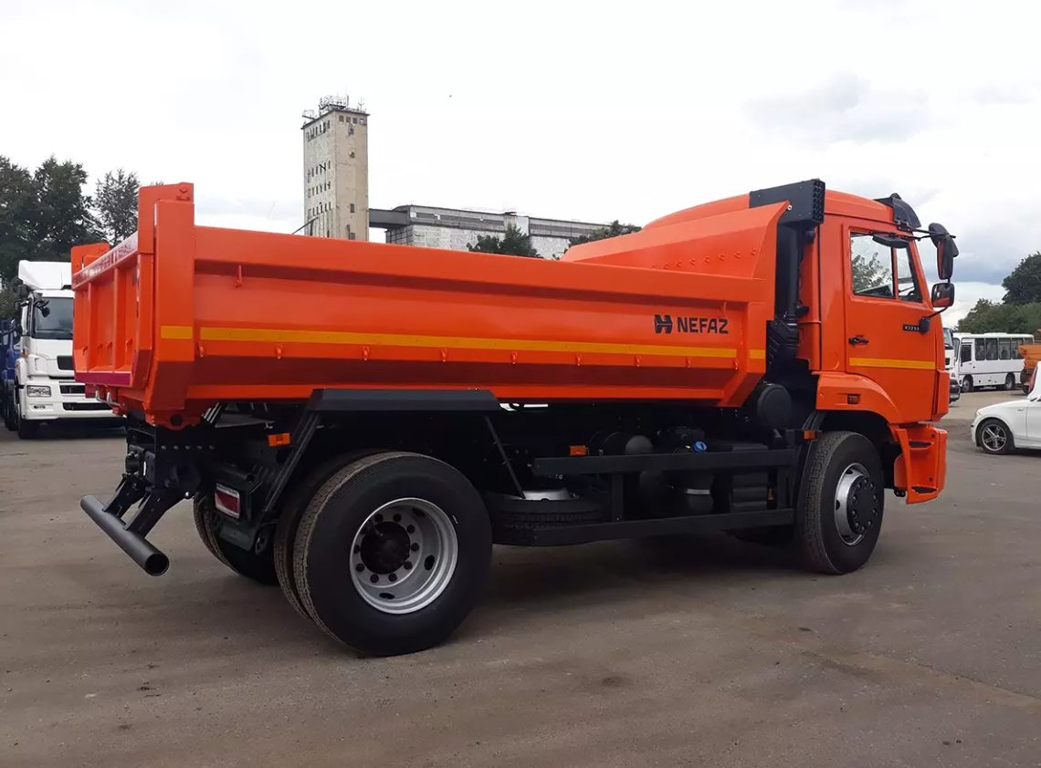 Кузов объемом 6 м³. Форма платформы - овальная, гидроцилиндр Палфингер. Конструкция самосвальной установки обеспечивает длительный срок службы и надежность, производитель ПАО "НЕФАЗ". Дорестайлинговая кабина без спального места.