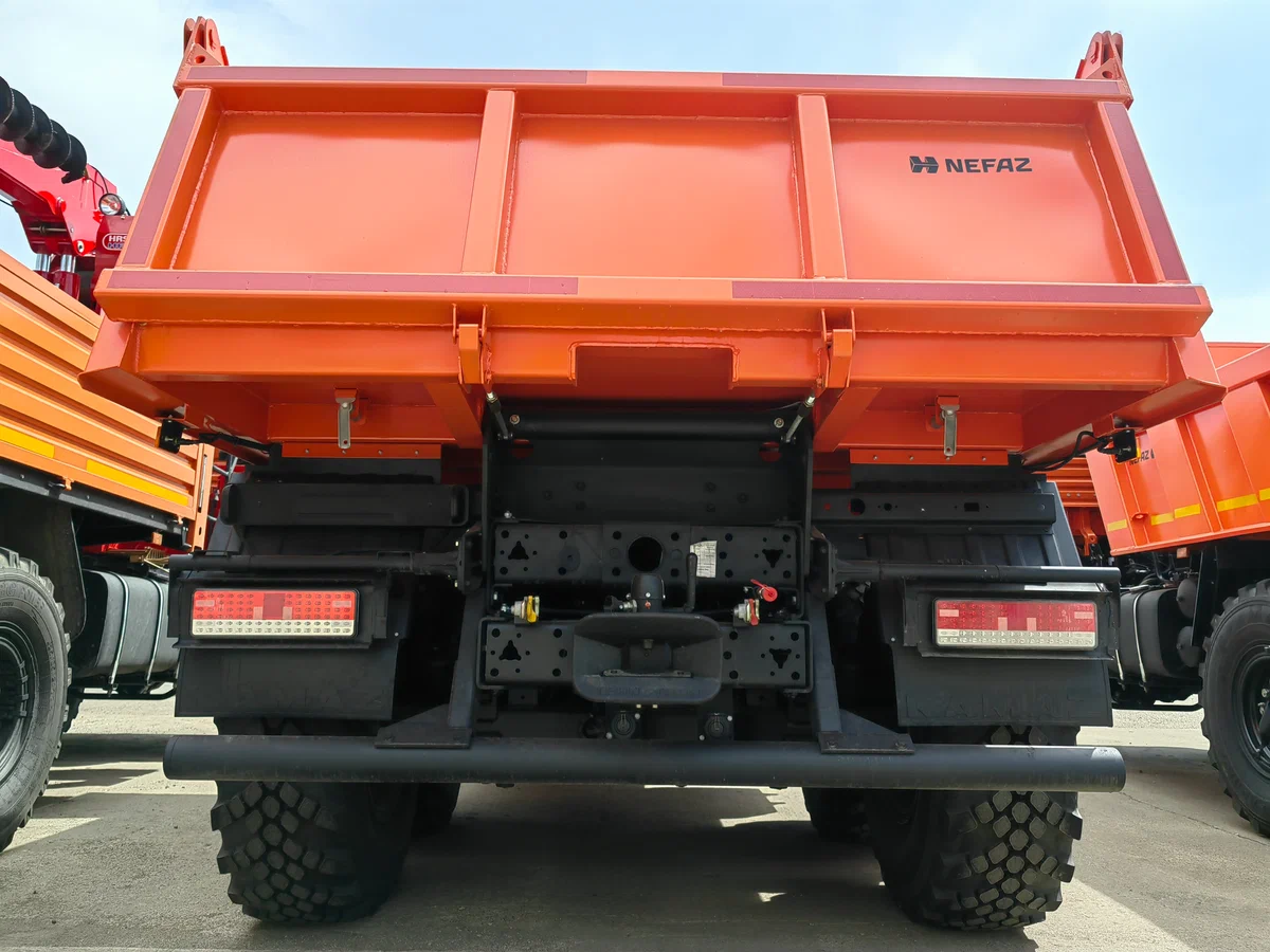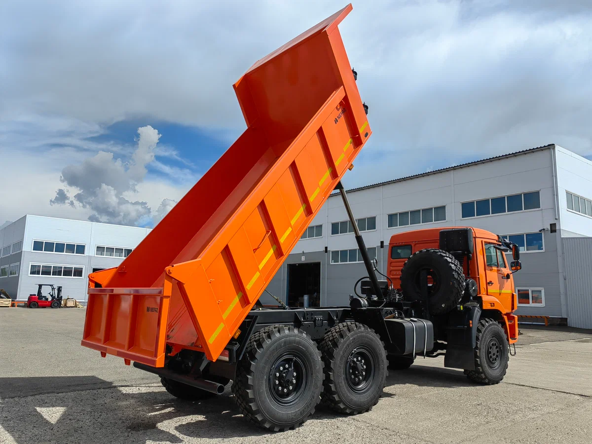 Прочная самосвальная платформа: Прямоугольная платформа объемом 6.6 куб. м изготовлена из высокопрочной стали 09Г2С. Усиленное днище толщиной 8 мм выдерживает высокие ударные нагрузки при погрузке твердых пород и тяжелых материалов. Разгрузка задняя, с углом подъема кузова до 50 градусов. Надежный гидроцилиндр "Палфингер".