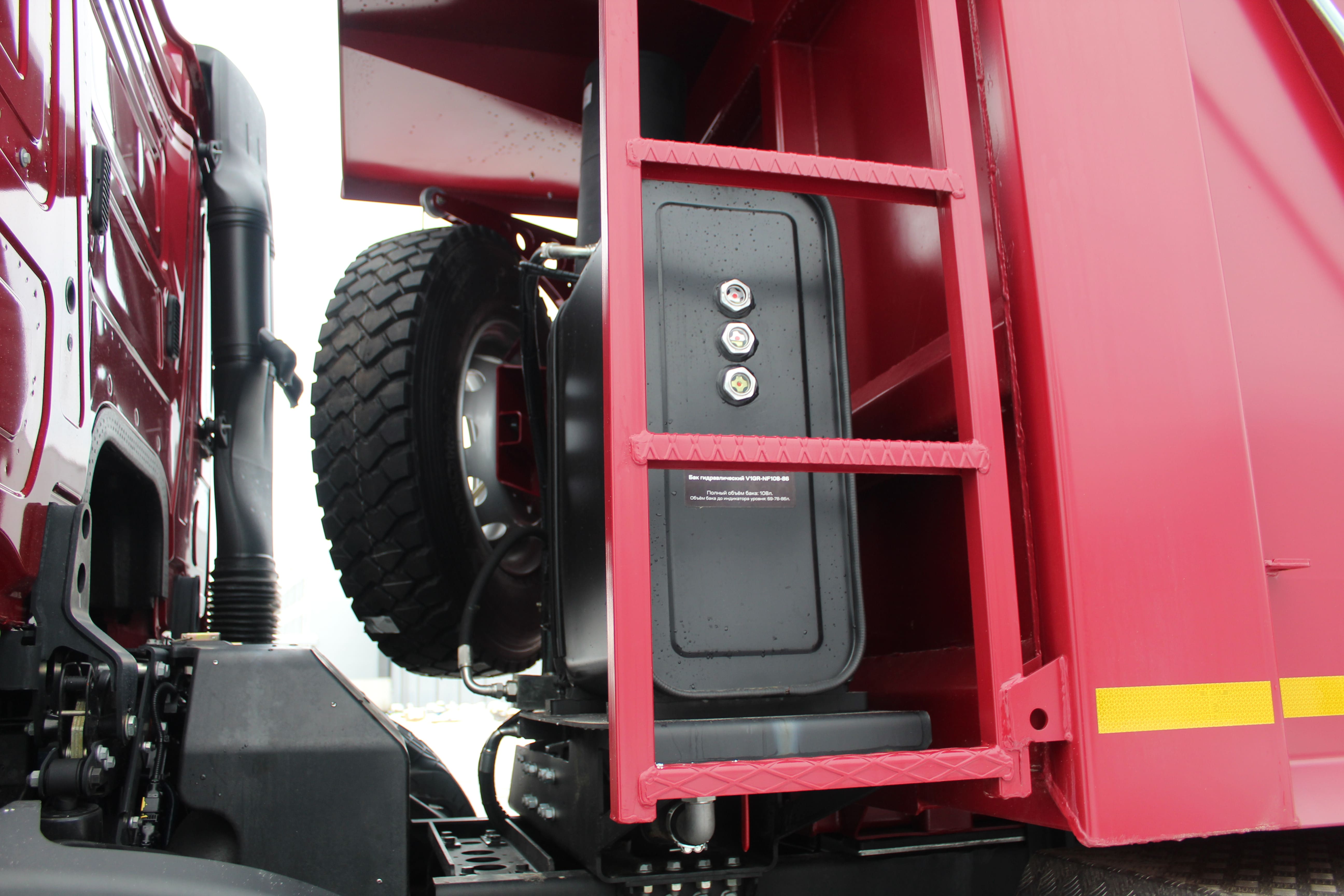 В наличии новый самосвал КАМАЗ-65952 8х4 с красной кабиной и красным бортом. Задняя разгрузка, прямоугольное сечение, объем платформы 25 куб. м., гидроцилиндр Палфингер