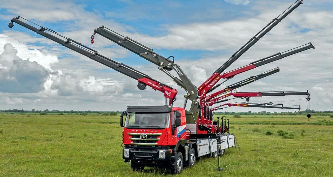 Модель NR829 4S (вес 3,6 т) имеет грузовой момент 28 тм и габариты 1100х2550х2400 мм. При вылете 12,05 м она способна оперировать грузами до 10,9 тонны. Давление в системе — 325 бар, объем бака — 200 литров. Угол поворота составляет 425°. Ширина опор 6000 мм.