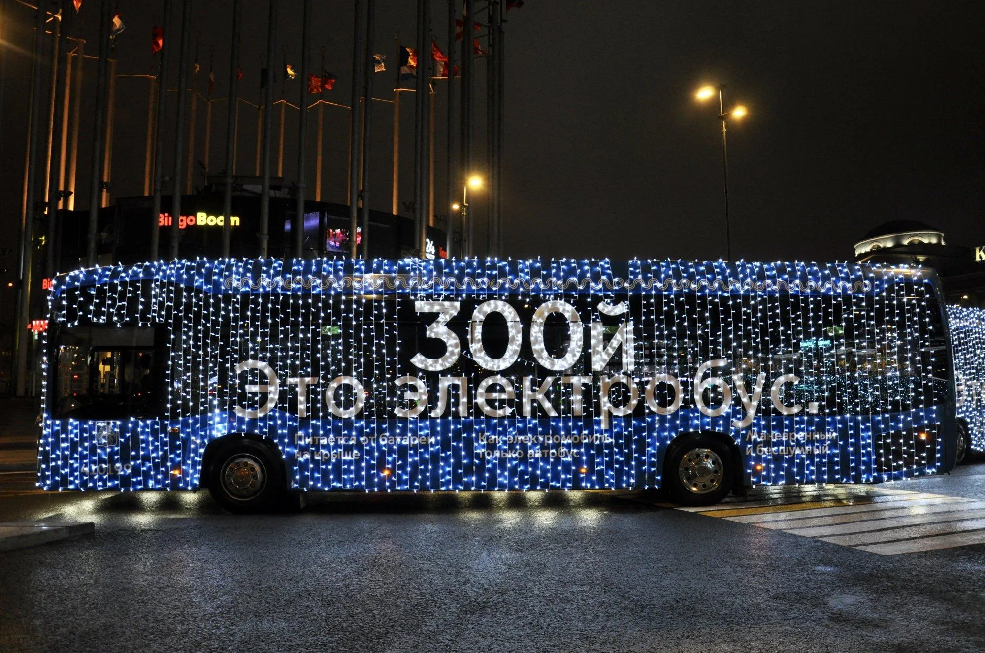 Оформлять московский транспорт к Новому году начали ещё 12 декабря, а 24 декабря на маршруты вышли электробусы «Мосгортранса», украшенные праздничной иллюминацией. Среди них и 300-й юбилейный электробус, поставленный «КАМАЗом», – он отличается от остальных соответствующей надписью, выложенной из гирлянд. Примечательно, что в новогоднюю ночь электробусы и автобусы, в том числе камазовские, будут перевозить москвичей и гостей столицы абсолютно бесплатно.